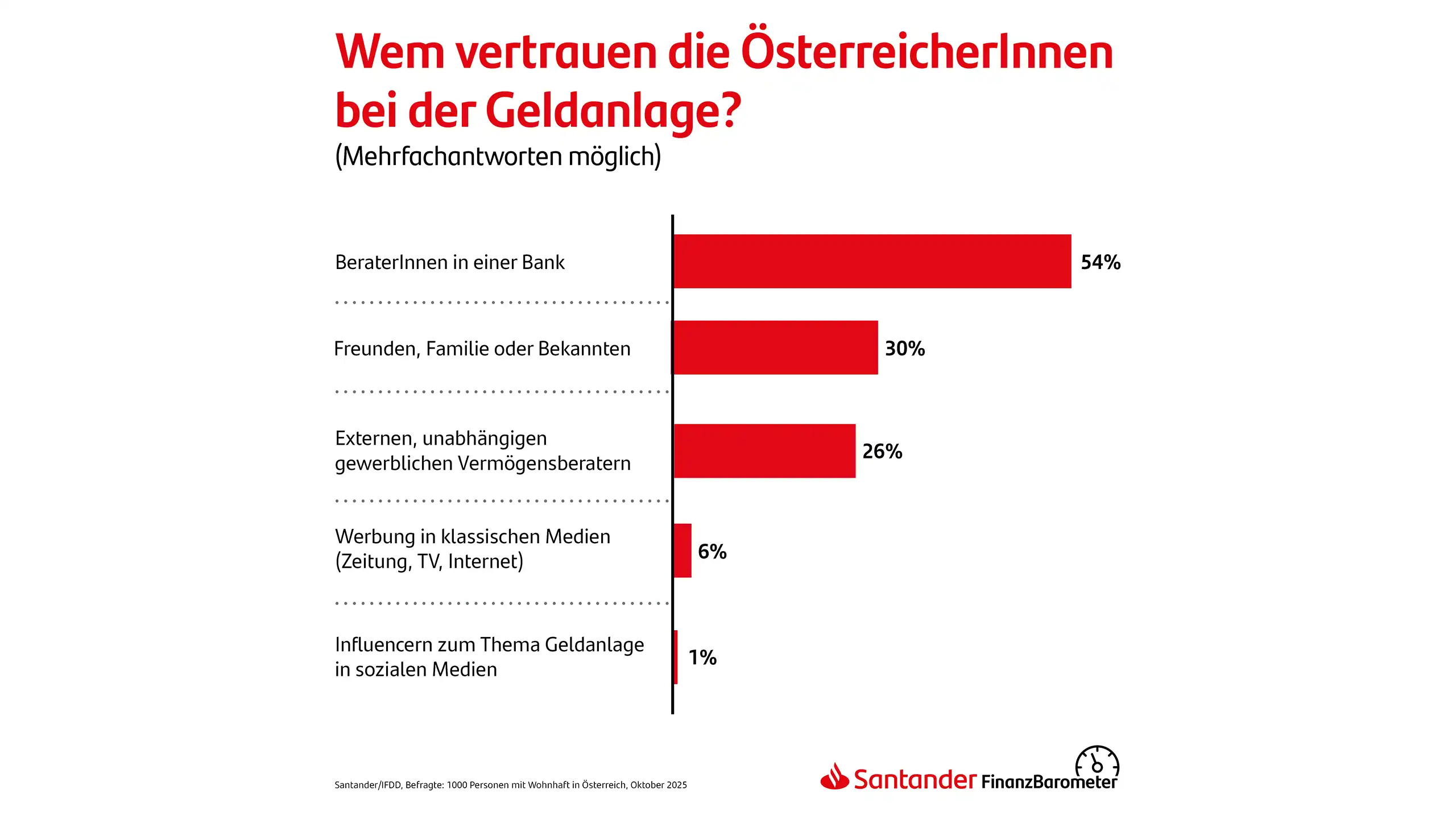 Das Santander-Finanzbarometer basiert auf einer repräsentativen Befragung von 1.000 Personen in Österreich, durchgeführt vom 2. bis 5. Oktober 2025 durch das Institut für Demoskopie und Datenanalyse (IFDD). Die Schwankungsbreite beträgt 3,1 Prozent.